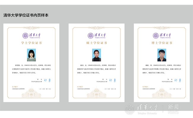 “清华版”学位证书分为证书和封套两个部分,其中证书部分为本次设计工作的主体,包含必要的学位授予信息,融合清华元素,体现清华风格,并给毕业生以永恒的回忆和纪念。