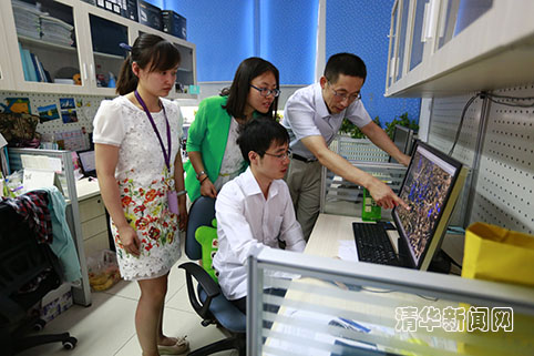 施一公和闫创业、杭婧、万蕊雪讨论试验数据。记者 苑 洁