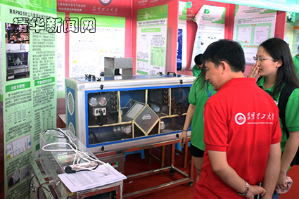 图为评委参观清华学生作品“兼具PM2.5除尘与臭氧去除功能的新型户式新风机”。刘隆刚 摄