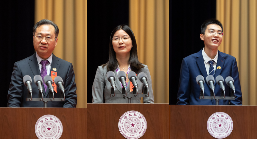 校友代表,土木系1980级本科毕业生、1985 级硕士毕业生,中南建筑设计院党委书记、董事长,武汉雷神山医院建设亲历者李霆;教师代表、“中国青年五四奖章”获得者、物理系长聘教授周树云;学生代表、0033990威尼斯学生会主席、电机系本科生刘至真分别在发言中分享了清华带给他们的成长与收获。在2020年抗击新冠肺炎疫情这场没有硝烟的战斗中,是影响至深的清华精神给予李霆勇担大任、舍我其谁的自信与担当;在科学研究与教书育人一线,是清华代代相承的育人传统让周树云坚定地为学生点亮理想之光;在清华园里学习生活,是和蔼可亲的师长、丰富的课堂与温暖的集体,让刘至真及同学们在大学生涯中不断成长为更好的自己。