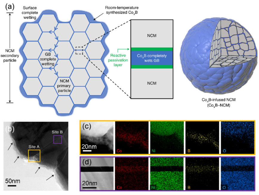 图4.基于反应浸润机理构筑的高稳定性硼化钴正极包覆