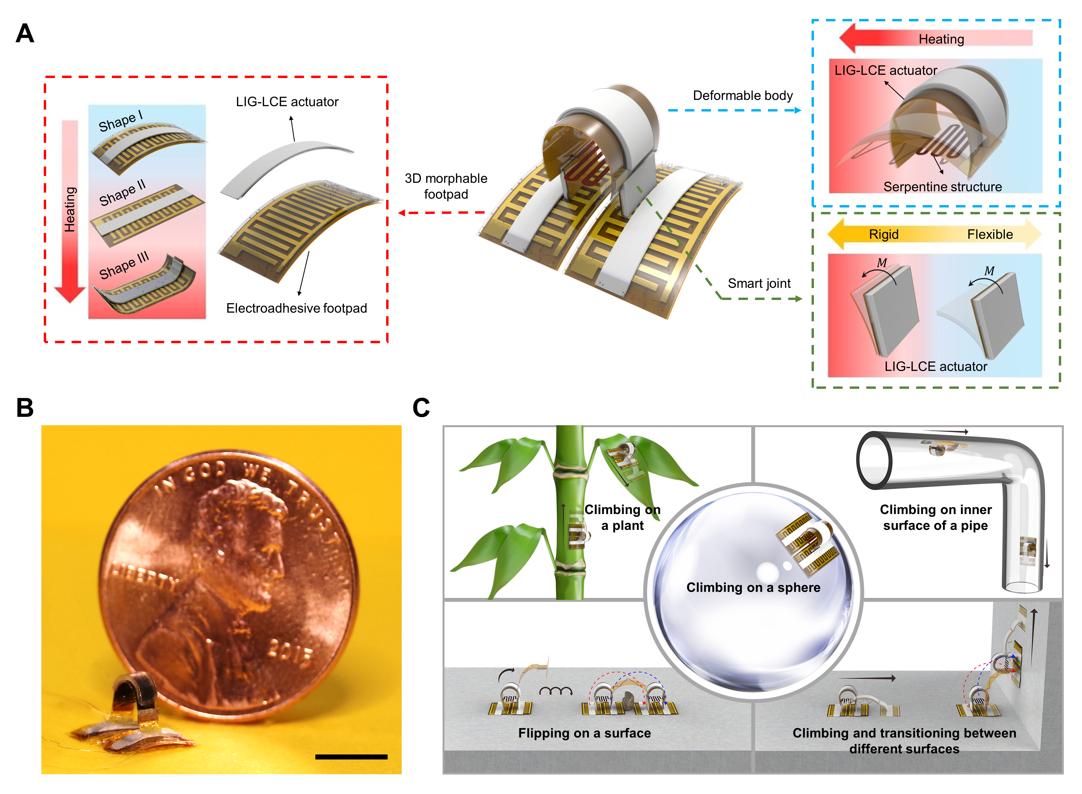 清华新闻网11月29日电 具备攀爬能力的微型机器人由于其微小的身躯,可以代替人类进入复杂、非结构化环境中执行特殊任务,在探测、生医等方面有着巨大应用价值。由软材料组成的类肌肉软驱动器可以为机器人提供极佳的灵活性、适应性和机械鲁棒性,相应的微型软体攀爬机器人也得到了研究者的广泛关注。然而,如何实现微型软体攀爬机器人在多种形貌表面上攀爬,甚至在两种不同表面之间过渡,仍然存在巨大挑战。