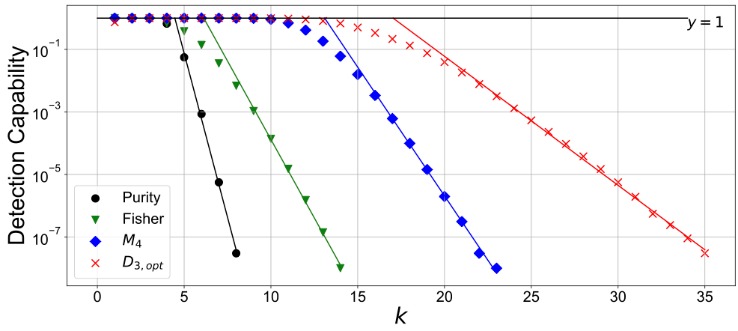 为了解决这个问题,研究人员开发了非线性纠缠判据,如著名的部分转置判据等。尽管比纠缠见证更有效,这些非线性判据在很大程度上依赖于量子态层析。然而态层析需要消耗指数多的资源,在实验上往往无法负担。在过去的几十年里,研究人员致力于优化这些强大的非线性纠缠判据以减少实验耗费。近年来,一类基于矩和随机测量的判据被提出,可以做到在不做量子态层析的情况下探测纠缠,很好地满足当前量子设备的限制。尽管比态层析高效得多,这些方法仍然需要指数多的资源耗费。