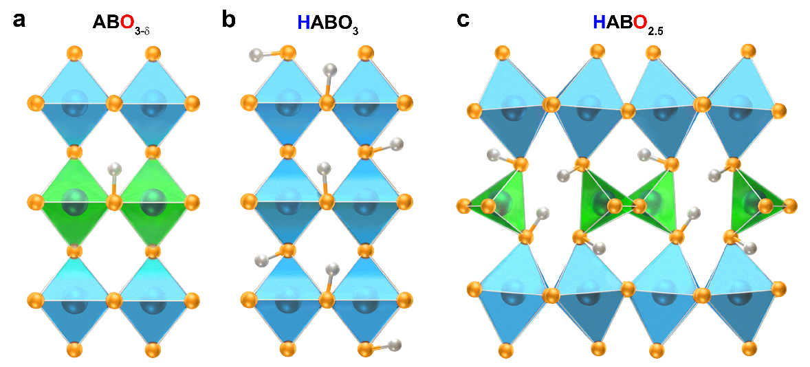 离子电导电解质可广泛用于燃料电池、气体分离、传感等应用领域。尤其是用于能源转换时,其可以直接将化学能转化为电能,具有转化效率高、绿色无污染等优点。相比氧离子电导电解质,氢离子电解质具有工作温度低、跃迁势垒小和扩散系数大等优势(图1)。目前,固体氧化物中氢离子电导电解质主要可以划分为两类。第一种(传统)氢离子电导电解质以钇掺杂的锆氧化物(Y-BaZrO3)为代表。这些材料通过低价态Y(+3)替代高价态Zr(+4)离子在晶格中引入氧空位(图2a)。高温下,通过H2O的分解及燃料气体(H2、CH4及CH3OH等)的催化作用等,氧空位(或部分晶格氧)可以结合HO·(或H·),形成具有跃迁或传导活性的氢离子,从而实现了氢离子在晶格中的宏观传输。但由于此类材料中只有少量(百分之几)的氧空位,需在高温(>500oC)下对离子进行充分的激活才能有效实现离子输运。除了这种传统氢离子电解质以外,最近几年研究者还报道了一种氢化钙钛矿结构的电解质(HSmNiO3,如图2b)。这类材料的晶格中不需要氧空位就可以存在大量氢离子,但由于传导空位的缺失,其氢离子电导的提高和工作温度的降低依然受到限制。值得指出的是,为激活电解质中的离子传输,高的工作温度往往对相关电解质和电极材料的稳定性和兼容性形成挑战。因此,设计室温区的新型氢离子电导电解质和探索其中新的传导机制是当前该领域所面临的关键科学问题之一。