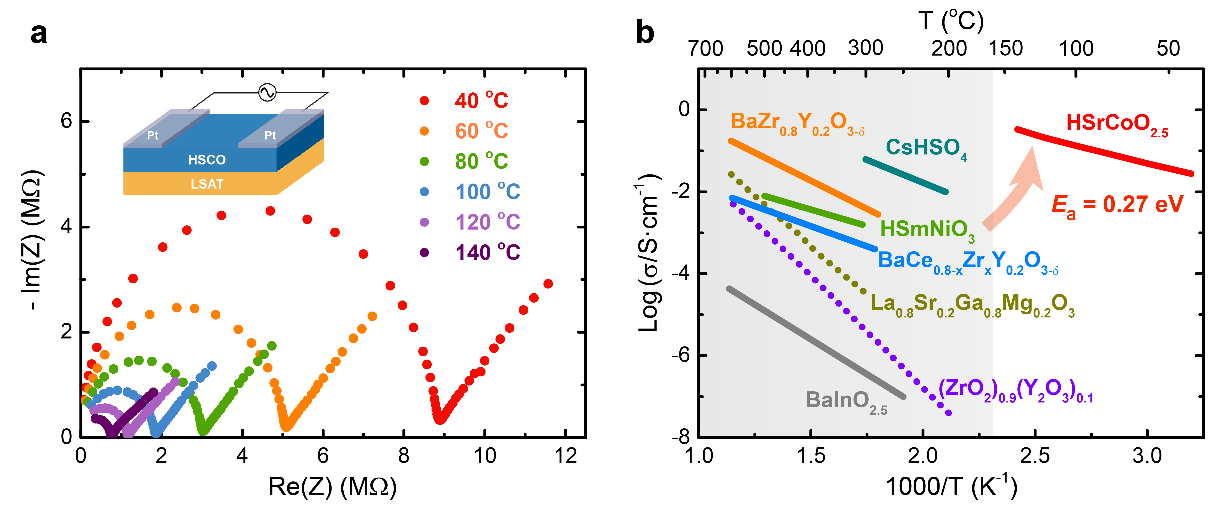 图3. HSrCoO2.5材料中低温(室温温区40-140oC)的氢离子电导特性