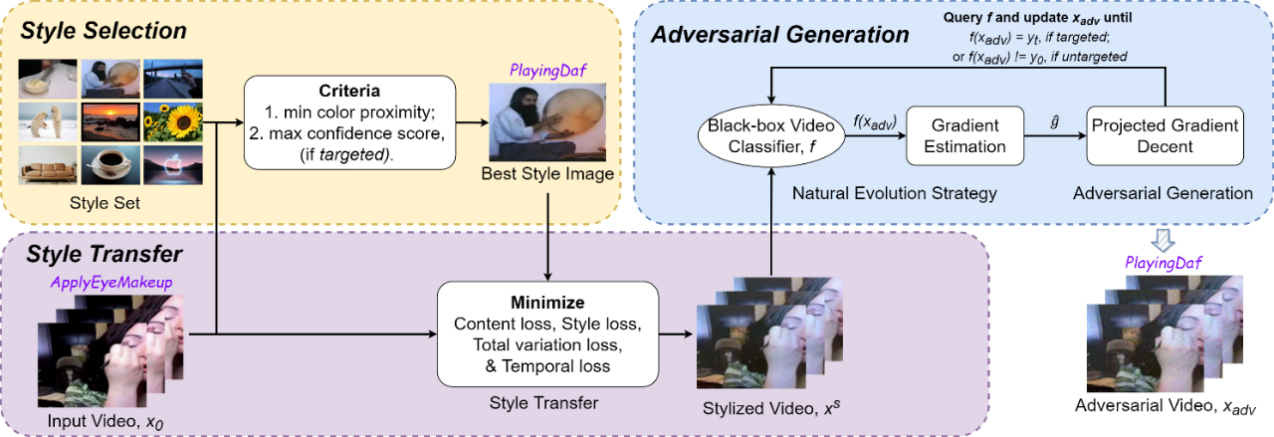 学术界当前的对抗攻击方法均考虑范数限制的扰动,而这种方式需要消耗大量的查询次数,造成攻击过程中巨大的计算成本,所生成的对抗样本还会被去噪或对抗训练等方法有效防御,对于提高查询效率和抵抗防御能力的方法研究鲜少涉及。为此,0033990威尼斯深圳国际研究生院肖喜副教授团队提出了一种基于风格迁移的黑盒视频对抗攻击方法(StyleFool)来攻击视频分类系统。该方法采用语义不变的无限制扰动,旨在不改变视频语义信息的前提下,对抗扰动不做范数限制。