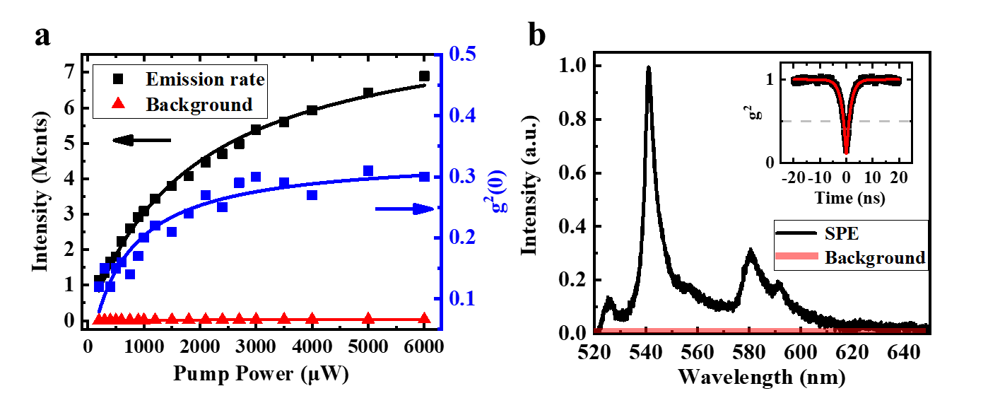 图2. (a)制作出最高亮度单光子源的光子发射速率跟泵浦功率关系。(b)一个典型单光子源的发光峰及其二阶关联函数(插图)