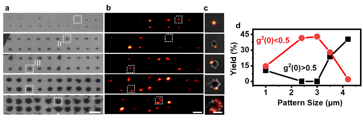 图1.制备得到的不同尺寸缺陷结构阵列(a)及相应的光致发光图像(b)(c)。(d)为统计得到的不同尺寸下单光子源产率