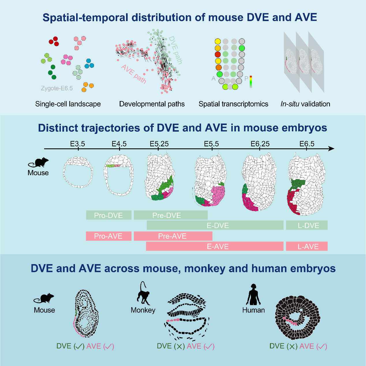 清华新闻网1月11日电 前后轴(anterior-posterioraxis,APaxis)建立是哺乳动物胚胎发育中的重要事件,该过程的异常将导致胚胎着床后发育失败与流产。着床后,小鼠胚胎远端内脏内胚层(Distal visceral endoderm, DVE)从远端向胚胎单侧迁移,而后定位于胚胎前侧,形成前内脏内胚层(Anterior visceral endoderm,AVE)。AVE释放的信号分子作用于临近的上胚层(epiblast,EPI),促进其特化具有胚胎体前侧的特征,而对侧EPI由于远离AVE信号而特化形成原条,至此胚胎前后轴正式建立。DVE和AVE作为前后轴形成过程中的关键细胞群体,经典理论倾向于认为它们是细胞迁移过程中同一类细胞的先后两种状态,即DVE是AVE的前体细胞;近年来也有研究提出DVE和AVE是同时存在的两类不同的细胞,且AVE可能来源于非DVE细胞。为此,DVE和AVE具体的起源和特化模式,以及对应的分子调控规律有待进一步揭示。