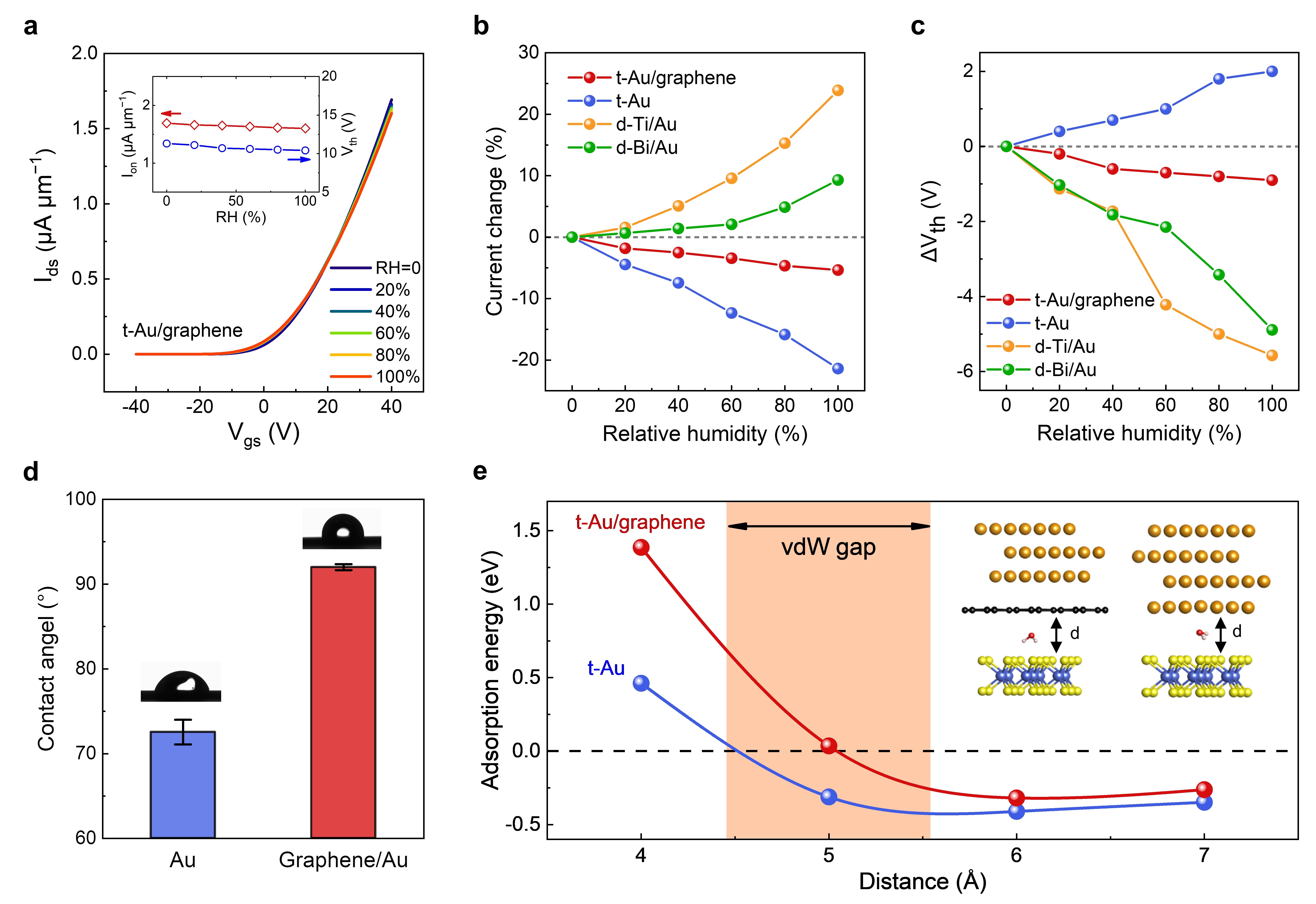 图3. t-Au/graphene接触的MoS2晶体管在高湿度下的稳定性