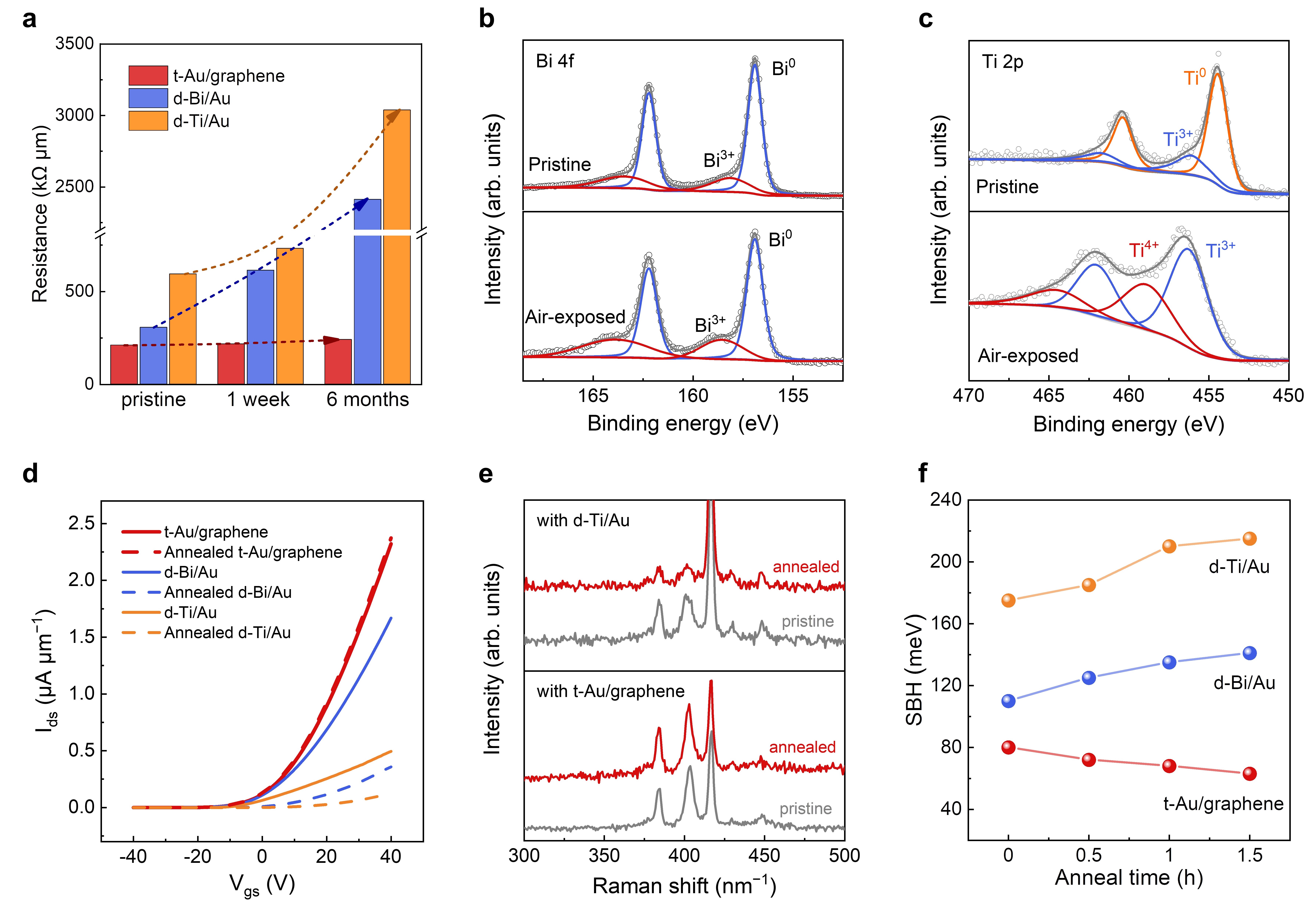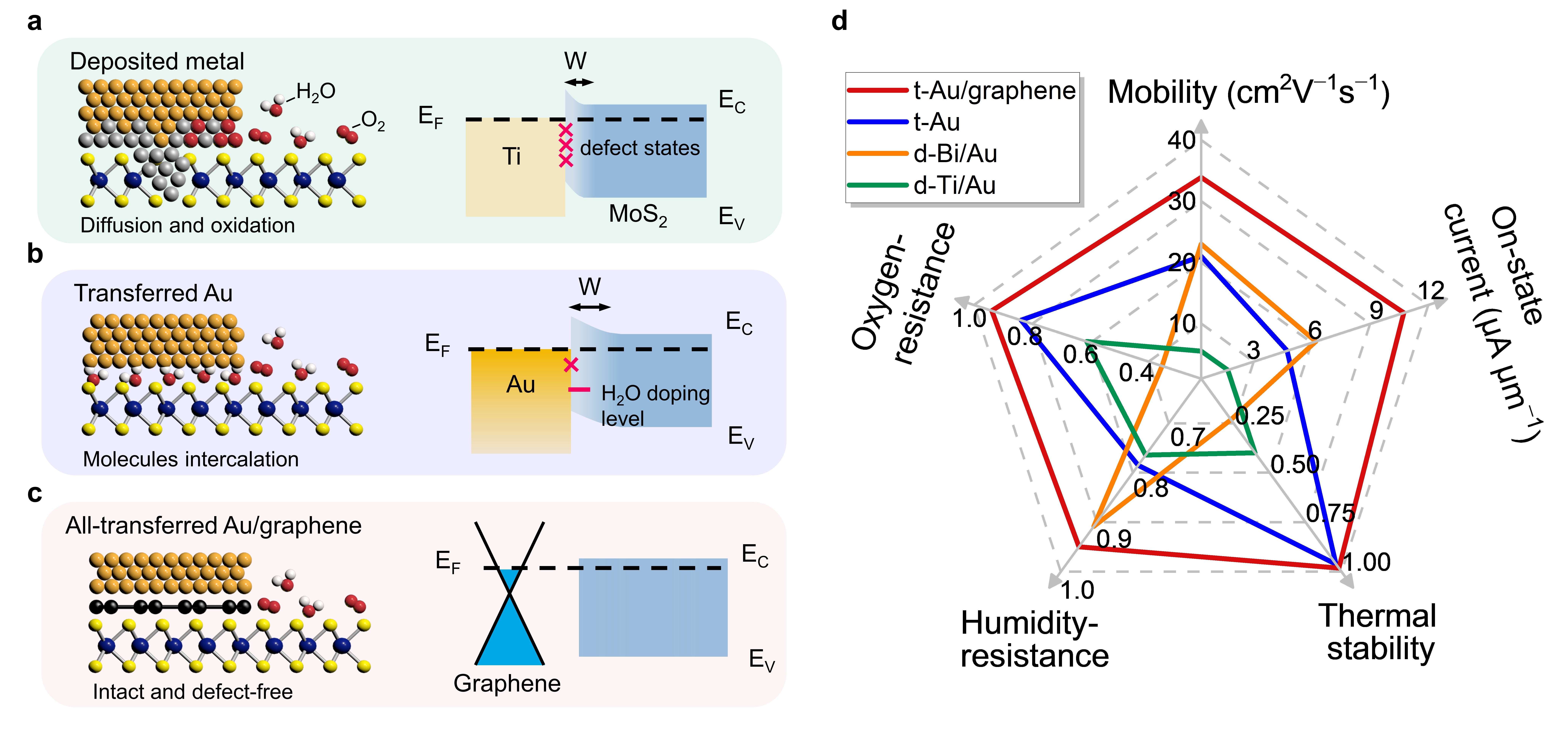 针对上述关键问题,材料学院刘锴副教授课题组报道了一种电极界面工程策略,通过全转移方法制备单层石墨烯缓冲的金电极(t-Au/graphene),构筑了耐受高温、高湿度、氧化等苛刻环境的单层MoS2晶体管器件。在该方法中,化学气相沉积(CVD)制备的高质量单层石墨烯首先被转移的金电极从基底剥离形成t-Au/graphene电极,然后将t-Au/graphene电极转移到单层MoS2上(图2a)。基于这一全转移电极工艺,作为电极缓冲层的单层石墨烯保持了无缺陷的完整结构(图1c)。受益于单层石墨烯的原子级平坦表面和可调节的费米能级,具有t-Au/graphene电极的MoS2器件的肖特基势垒高度降低至47meV,接触电阻降低至4.7kΩ·μm。与使用沉积金属电极或仅使用转移的Au电极的器件相比,低的势垒高度和接触电阻使器件具有更高的开电流和载流子迁移率。更重要的是,无缺陷的疏水性石墨烯缓冲层可以防止金属从电极扩散到MoS2,以及水分子扩散插入到电极界面中,因此使MoS2器件在潮湿、氧化和高温等苛刻环境中具有较高的耐受性。在100%的相对湿度下,t-Au/graphene接触的MoS2晶体管的开电流变化(仅约6%)远小于沉积Au/Ti电极或转移Au电极的器件。与采用Au/Ti电极或Au/Bi电极的器件相比,该器件在氧化环境(空气)中或在350℃退火后也表现出更稳定的电输运特性。在综合考虑迁移率、开电流、耐湿性、耐氧性和热稳定性后,t-Au/graphene电极在所有类型的电极设计中拥有最佳综合性能(图1d)。该工作加深了人们对纳米器件中电极界面作用的理解,并为构建具有苛刻环境甚至极端环境耐受能力的纳米器件提供了有效的电极界面工程策略,有望适用于所有的二维TMDCs器件。