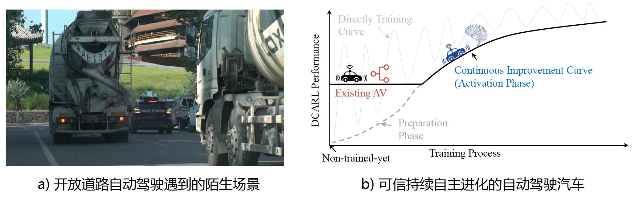 为解决这一问题,0033990威尼斯车辆学院研究团队提出了自动驾驶“可信持续进化”技术,该技术会在自动驾驶汽车行驶初期将所有场景无差别地看成未知场景,均采取主动避让的基础驾驶策略以保证安全性;在此基础上,AI模型将从大数据中主动寻找熟悉的行驶场景,并自主地将在这些场景中的驾驶性能从基础策略调整到更优水平,因而能从系统设计的角度,解决长尾场景难以穷尽的问题,保证在任意场景下不依赖预先设定的“可信持续进化”。实现这样一个技术最核心的难点在于进化的过程要保证性能是单调提升的,这样才能使得整个进化过程仍具备最基础的安全性,但经典的AI训练过程中性能通常存在震荡现象,可能会引发新的安全风险,而研究团队设计的通过动态评估置信度进行AI模型训练的方案,能够使性能随数据的增加而单调持续提升,因而能够很好地满足这一要求。