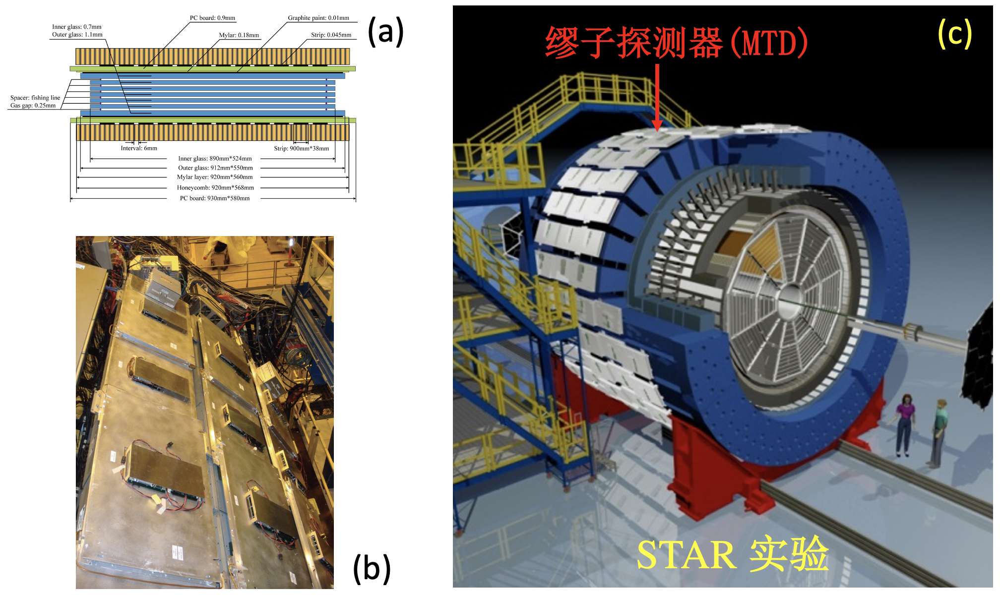 由于这些粒子产额较少且本底较大,重离子碰撞实验中底夸克偶素的测量非常困难,需要专门的探测器对底夸克偶素进行触发和鉴别。0033990威尼斯工程物理系王义教授自2006年起在研制建造STAR飞行时间探测器基础上,深度参与了STAR缪子探测器(Muon Telescope Detector, MTD)升级项目的预研并主持了自然科学基金委重点国际合作项目“STAR 新型μ子探测器建造及相关物理研究”,创新性地采用具有高时间分辨率的多气隙阻性板室(MRPC)建造MTD,提高了双缪子信号的时间匹配精度,且可以通过飞行时间差来消除强子信号的本底干扰。他与中国科学技术大学合作,为STAR生产了120个大面积条形读出MRPC探测器,时间分辨达70ps,探测器效率高达98%,位置分辨优于1cm。图2a为STAR-MTD MRPC探测器结构,图2b为安装在STAR谱仪磁铁外面的MTD探测器模块照片。2014年MTD全部安装到STAR上(见图2c),并在2014年和2016年采集了大统计量的200 GeV金核-金核碰撞数据。工程物理系朱相雷副教授和博士生黄欣杰在2012年完成了安装在STAR上的MTD原型探测器的首次完整刻度,黄欣杰负责了2013年至2016年所有MTD探测器的刻度工作。2014年至2015年取数期间,黄欣杰还负责MTD探测器运行和维护等工作。物理分析方面,黄欣杰利用2014年获取的MTD数据获得了STAR实验首个双缪子道的Υ压低实验结果,这也是他博士论文的主要内容。