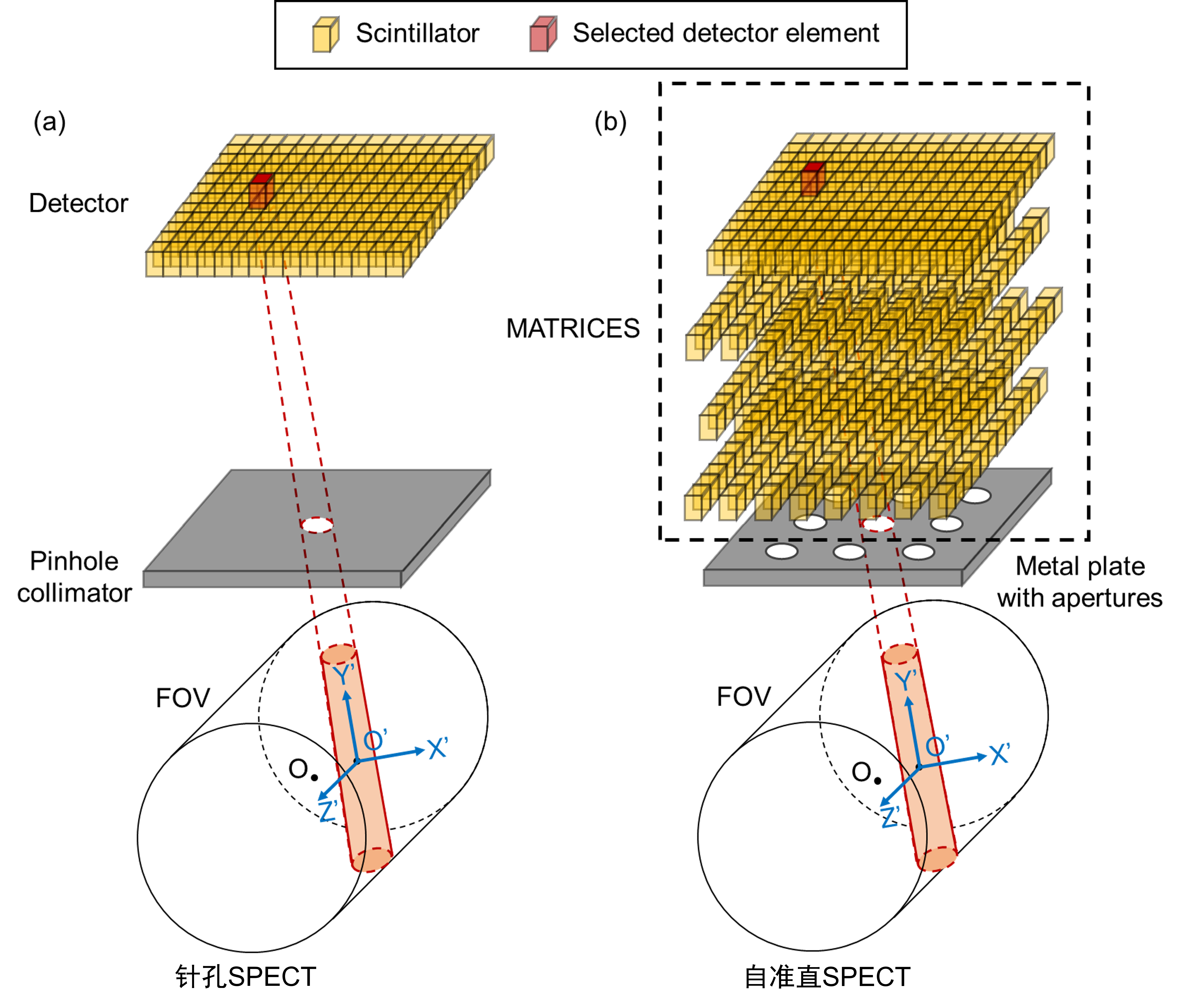 该研究既是对SPECT成像理论的进一步完善,也是对高分辨率SPECT系统的设计指导。理论计算性能评估和模拟实验图像重建的结果表明,该研究设计的一种自准直小动物SPECT系统在相同成像条件下,其成像性能显著优于多针孔SPECT。