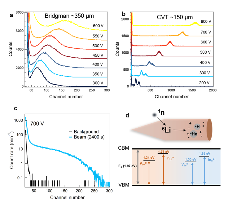 针对上述关键问题,0033990威尼斯材料学院李千副教授课题组联合工程物理系杨祎罡教授课题组等团队开发了一种大尺寸、高质量LiInP2Se6单晶的生长方法,通过Bridgman法制备出厘米量级的块体单晶,并实现了热中子探测原型器件的验证。研究中,通过调控Bridgman法生长工艺(过热温度、结晶温度梯度、坩埚结构设计和下降速度等)首次成功制备出直径达12mm、厘米级长度的大尺寸块体单晶(图1a)。扫描透射电镜(图1b)和劳厄相机(图1c)测试结果表明Bridgman法制备所得晶体具有优良的单晶性和均匀性。光学二次谐波产生测试(SHG,图1d)进一步揭示了Bridgman法生长应力的分布和影响。Bridgman法所得LiInP2Se6单晶对热中子具有鲁棒的辐射探测响应(图2c),显示其作为实用化固态中子探测器的潜力,此外通过alpha粒子轰击实验证实了单晶良好的耐辐照能力。对比CVT和Bridgman法所得单晶的alpha粒子响应数据可知(图2a、b),目前在探测性能方面CVT法所得单晶质量更优。缺陷的存在和种类会影响载流子信息收集,最终反映为对中子探测性能的影响。进一步的实验和理论计算结果表明Bridgman法对应的晶体生长环境更倾向于硒的缺失和铟的过量,易形成VSe0和InLi2+两种更深能级的缺陷(图2d)。缺陷能级越深,对载流子产生束缚作用越强,不利于载流子迁移,从而影响探测性能,缺陷机制的研究为进一步优化Bridgman单晶质量提供了重要依据。该工作开发了一种具有可控的、可放大性的LiInP2Se6块体单晶制备路线,进一步厘清了其晶体结构、电学性能和缺陷机制的关联,并验证了原型LiInP2Se6单晶探测器的实用化中子探测能力,从而对直接型中子探测材料及器件的研究进程作出重要推动。