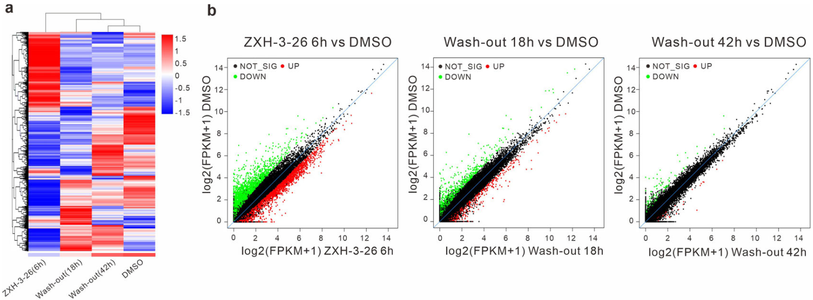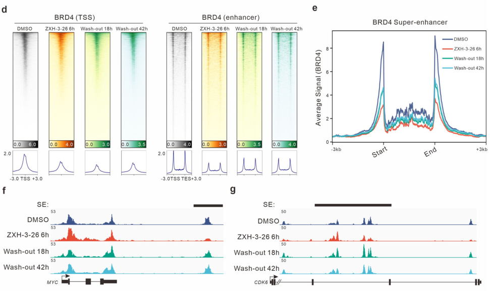 针对以上有趣的现象,研究者们进一步开展多组学分析阐释其可能的生理功能意义。通过RNA-seq和Cut&Tag-seq探讨对照组、BRD4-PROTACs处理后6小时、wash-out 18小时、wash-out 42小时的基因表达谱,以及BRD4在TSS区、enhancer区和super-enhancer区的定位变化。数据显示, wash-out 42小时组的基因表达情况已经恢复到与对照组接近。更令人意外的是,随着降解剂的去除,BRD4在短时间内迅速恢复并更偏好占据在super-enhancer区,尤其是一些关键癌基因和细胞周期基因的super-enhancer区(图3)。这一结果说明PROTAC可以成为研究生物大分子凝聚物的生理病理功能的一种强有力工具,它的降解快速且可逆是其作为LLPS研究工具的关键优势。