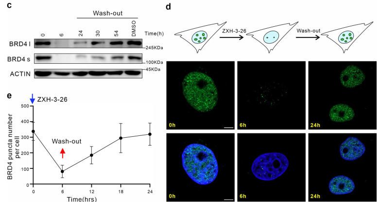 随后,研究者们利用PROTAC的可逆性进一步探究该技术运用于LLPS研究的潜力。有趣的是,他们通过Wash-out实验发现,去除BRD4-PROTACs后24小时,内源的BRD4凝聚物数量已几乎恢复到原始水平,而此时BRD4的蛋白水平才刚刚开始出现恢复迹象(图2)。即BRD4相关凝聚物的恢复可能优先于BRD4蛋白水平的恢复,这是PROTAC应用于LLPS研究首次发现的现象。