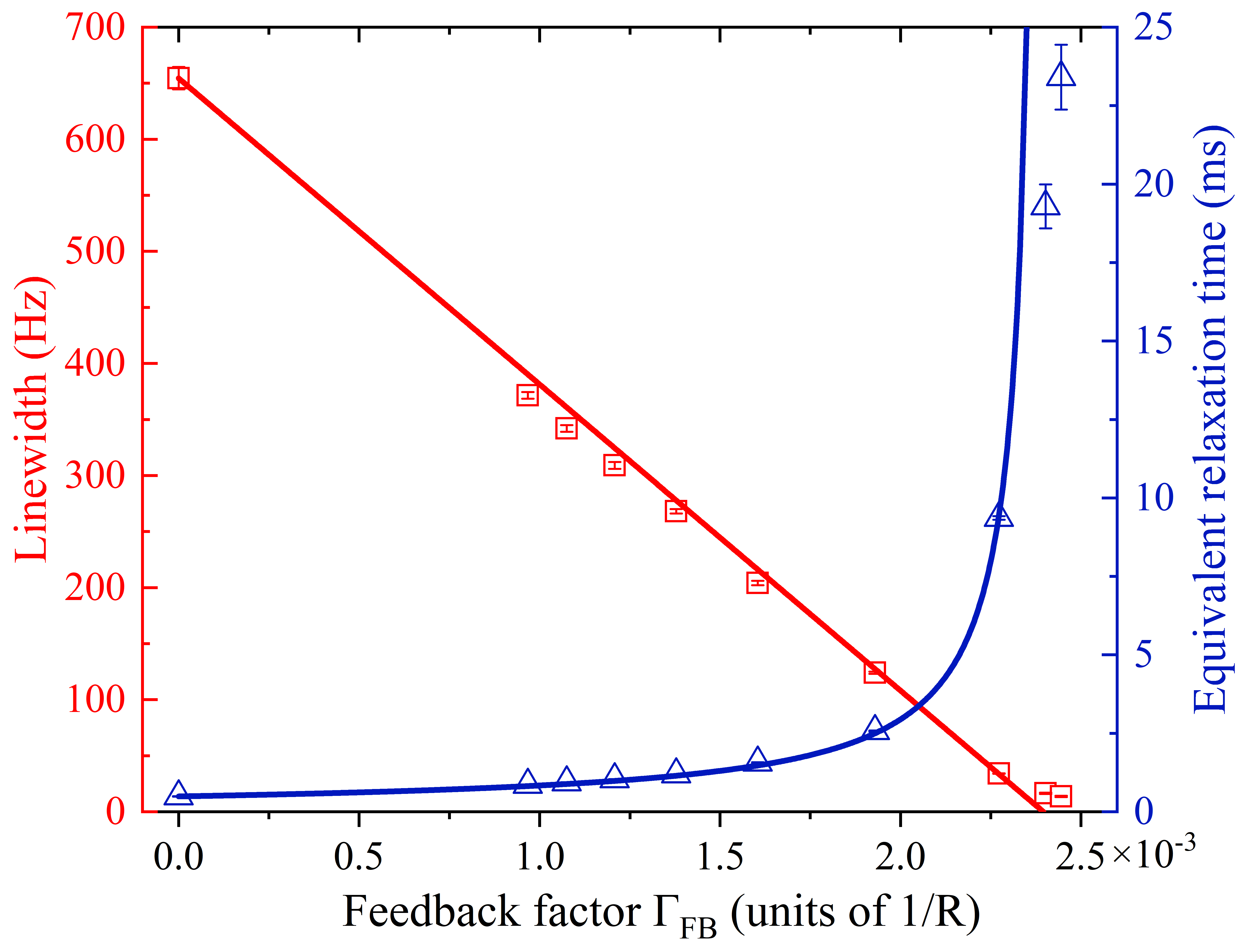 图3.线宽和等效弛豫时间随反馈系数变化的实验结果