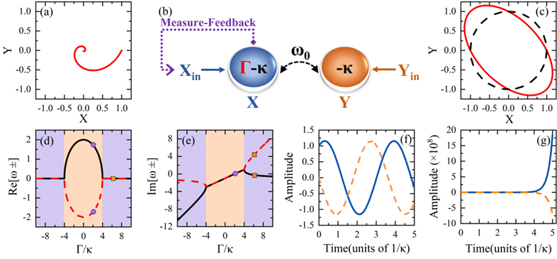 图1.PT对称型反馈原理图。(a)典型耗散谐振系统相图。(b)PT对称型反馈系统示意图。(c)相图对比,PT对称系统(红色实线),无耗散的厄米谐振系统(黑色虚线)。(d)-(e):本征值实部和虚部随反馈系数的变化。(f)-(g):在PT对称和破缺区间,正交分量的时间演化
