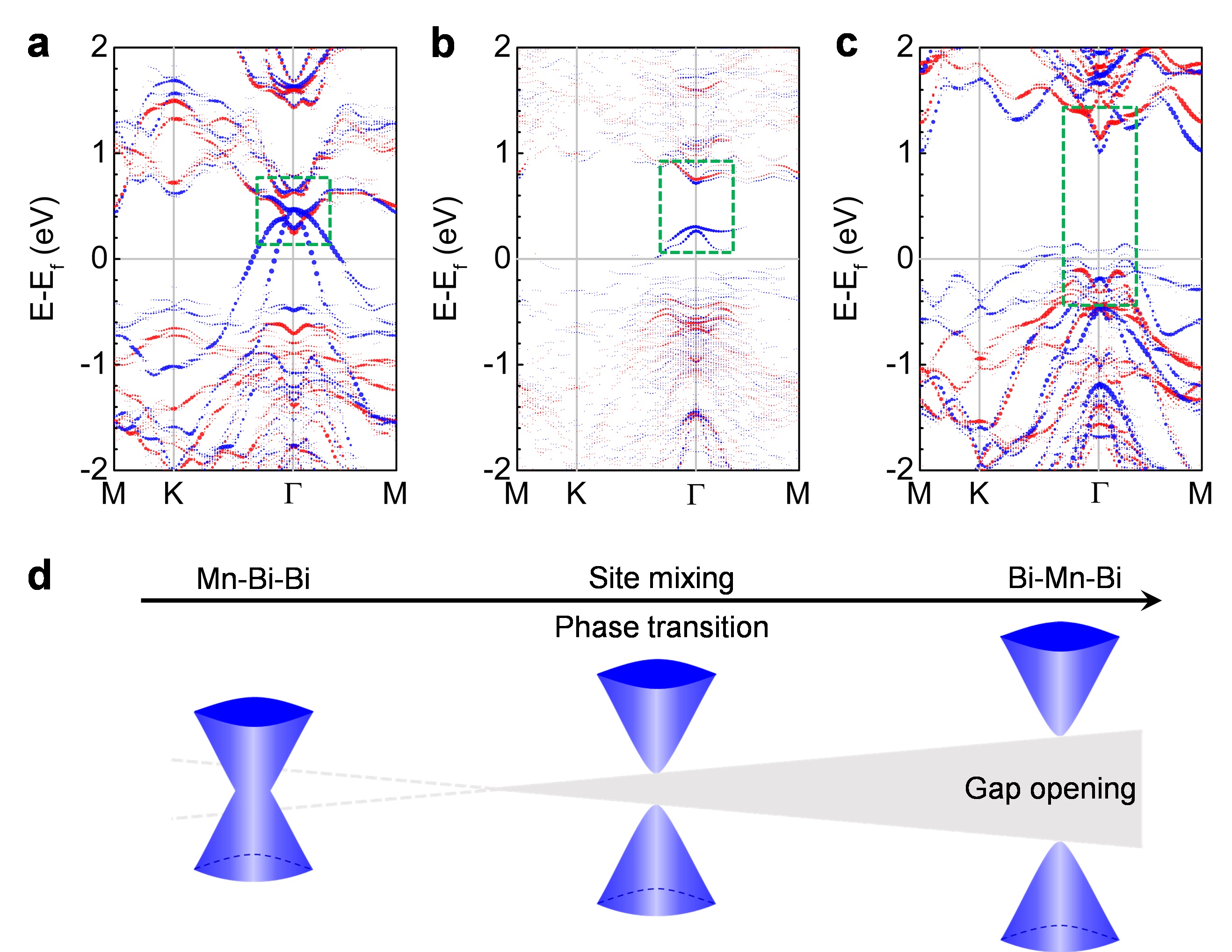 图3.由MnTe/Bi2Te3单层到MnBi2Te4单层相变的能带演化过程