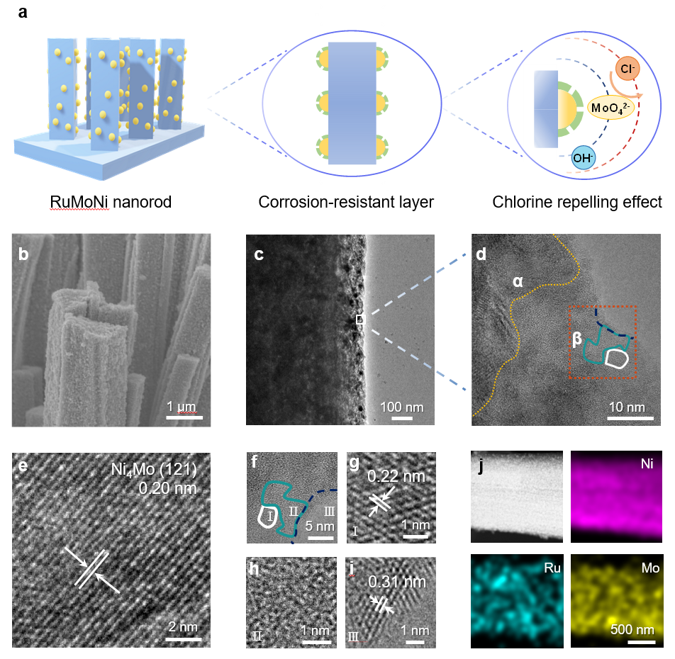 近日,0033990威尼斯深圳国际研究生院刘碧录教授团队开发了一种高性能、耐腐蚀海水电解催化剂。研究人员通过水热法和电化学活化法制备了钌钼镍(RuMoNi)催化剂,这种催化剂由表面多孔纳米棒阵列组成。高分辨透射电镜表明该催化剂由镍钼合金(Ni4Mo)导电基底、氧化钌/羟基氧化镍(RuO2/NiOOH)活性相和钼酸镍(NiMoO4)抗腐蚀层构成。