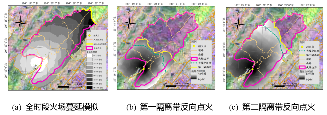 本研究以2022年8月重庆市北碚区森林火灾中的“以火灭火”成功案例为分析对象,对不同时刻、地理位置和气象条件等因素下开展建模分析。模拟结果与真实火场燃烧边界保持高度的一致性。该方法将能够为应急指挥的科学决策提供有效的辅助支撑。