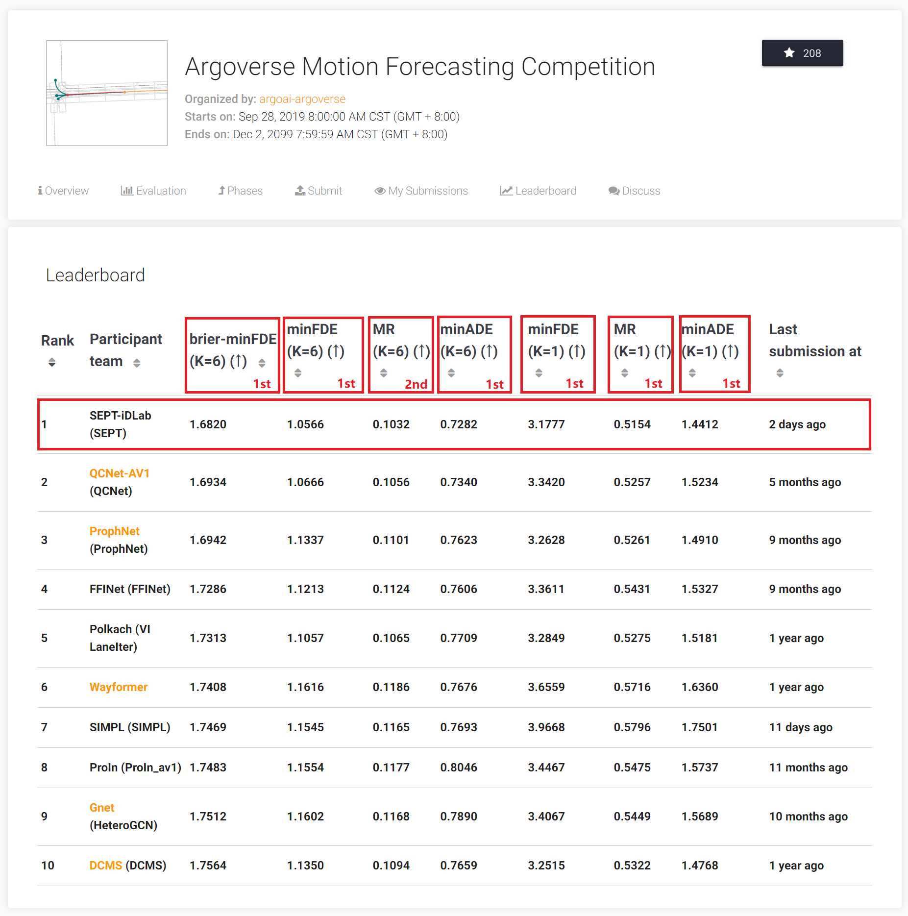 Argoverse竞赛榜单(网址:https://evals.ai/web/challenges/challenge-page/454/leaderboard/1279)