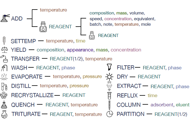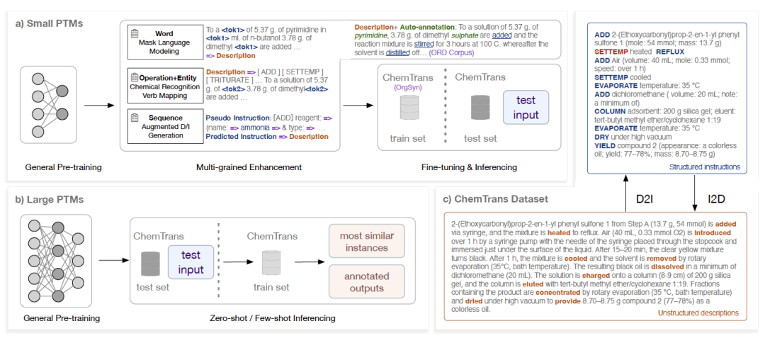 该研究结合大量化学文献的统计结果和专家知识,制定了化学合成指令的层次化框架,包含16种元操作和18种参数;参考序列匹配任务的评测方式,设计了SeqMatch指标,对合成指令转写任务的标准化评测具有重要作用;提出了针对合成化学的多细粒度知识增强预训练方法,在单词级、化学实体级、元操作级和合成序列级,分别设计了掩码学习、实体识别、操作映射、序列预测等多种预训练任务,赋予模型以当前任务所需的丰富的化学知识。