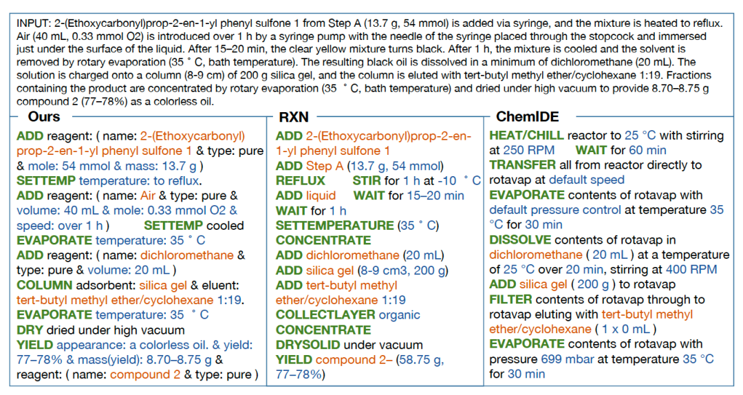 该系统相较于其他类似工作可以实现更完备而准确的合成指令生成,也能根据指令撰写流畅自然的合成化学文献段落。该工作还探索了当前模型的更多可能用途,例如针对特定合成指令预测下一步骤、根据转写表现筛选出更简明规范的文本等。这些实验表明,预训练模型可以提供面向通用合成规律以及合成描述规范性的洞察。