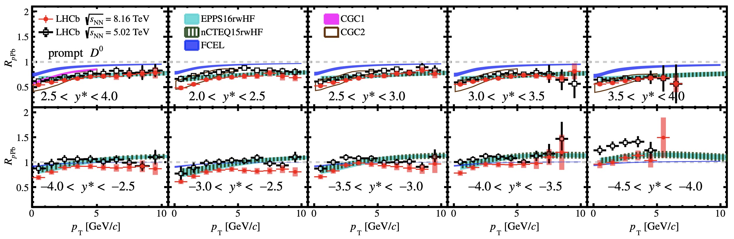 LHCb质子-铅核碰撞实验前向(上)和后向(下)快度区间D0介子的核修正因子