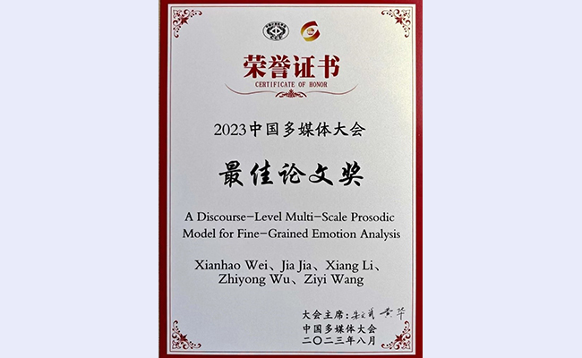 表现力语音合成的篇章情感分析上的研究成果,近日以“基于篇章级多尺度韵律模型的细粒度情感分析方法”(A Discourse-Level Multi-Scale Prosodic Model for Fine-Grained Emotion Analysis)为题,被“2023中国多媒体大会”(China Multimedia 2023) 录用,并获得最佳论文奖。