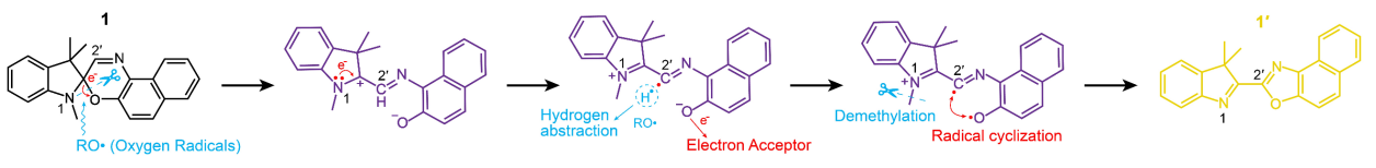为了证明上述方法能够有效地应用于介电聚合物的电老化示警,课题组从自诊断聚合物复杂的电老化产物中识别并确定了指示剂受激变色后的化学结构,进而严格论证了电老化产生的氧自由基原位诱导指示剂变色的自诊断机理。课题组利用色差评价公式对变色前后的颜色差异进行量化,利用红外光谱表征材料的结构降解程度,利用泄漏电流和局部放电评估材料的性能损失,证明了颜色改变与电老化程度之间的定量关联关系。