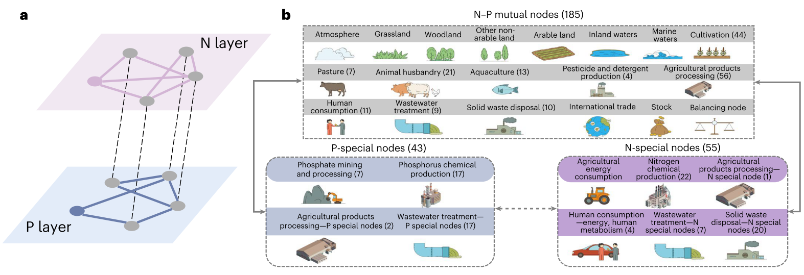 联合团队通过物质流分析方法首次构建了中国氮-磷耦合循环网络,在此基础上运用生态网络分析等方法测度了网络韧性并揭示了其影响因素。研究表明:中国氮-磷耦合循环网络为由283个节点组成的双层网络,其中185个节点为氮磷耦合节点,通过氮元素和磷元素在自然生态系统和食品系统的代谢过程将氮网络层和磷网络层紧密连接在一起,从而形成复杂的氮-磷耦合循环网络。在1980-2020年间,中国的氮-磷耦合循环网络处于过度高效阶段,韧性呈下降趋势,氮、磷网络层韧性最大最小值之差分别为7.61%和12.57%。这将导致中国氮-磷耦合网络抗击外界风险冲击的能力降低。食品需求增长驱动的化肥施用比例增加是导致氮-磷耦合循环网络韧性降低的关键因素。中国的氮-磷耦合循环网络中的节点对氮网络层和磷网络层韧性的变化同时存在协同效应和权衡效应。相比氮网络层而言,磷网络层受到人类活动的影响更大。