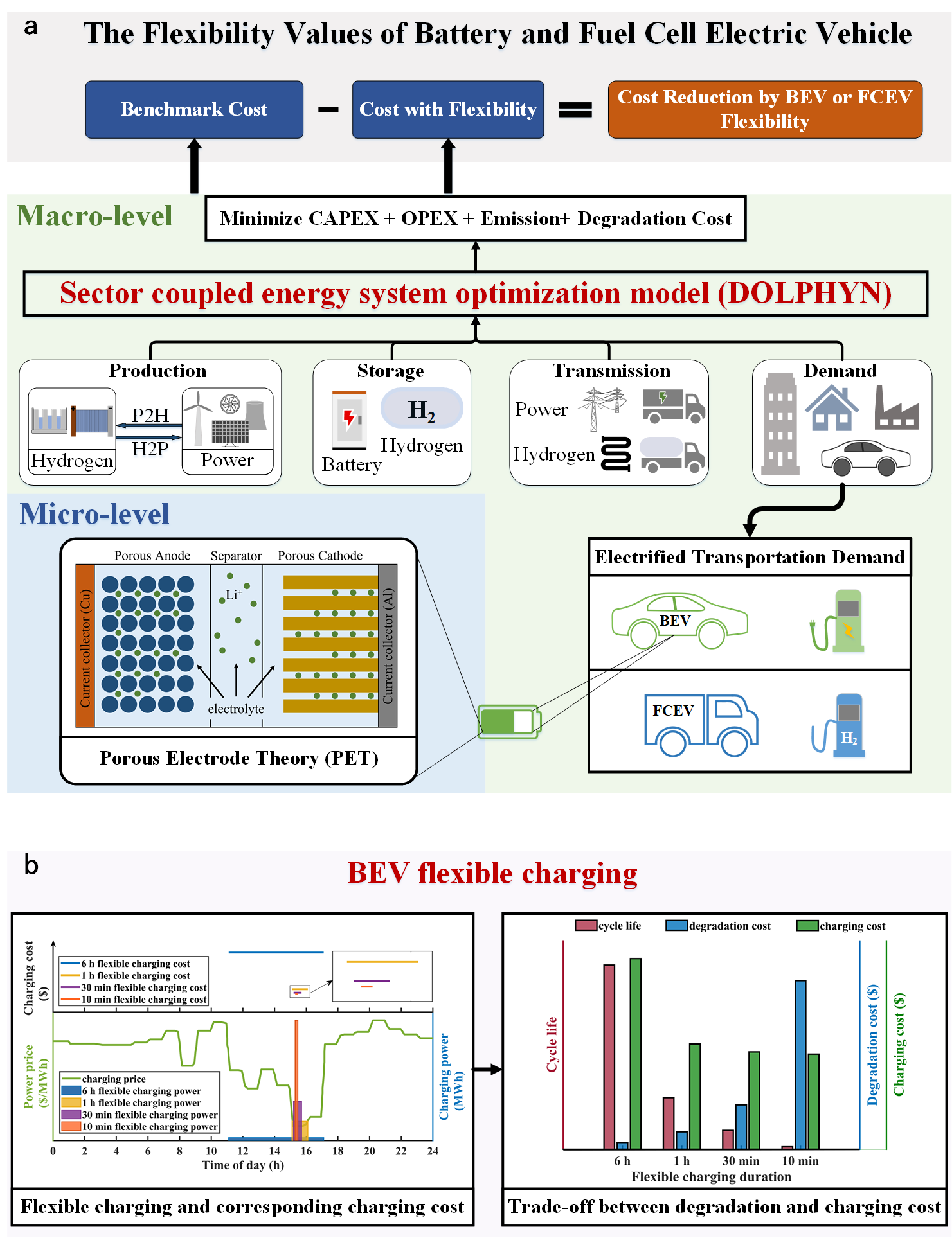 相关研究成果以“一种跨尺度能源优化框架用于评估纯电动汽车与燃料电池汽车的灵活性价值”(Across-scale framework for evalsuating flexibility valuesofbattery andfuelcellelectricvehicles)为题,于1月4日发表在《自然·通讯》(Nature Communications)期刊上。