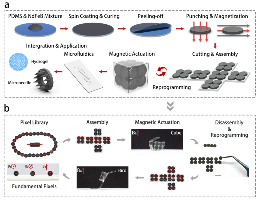 相关研究成果以“基于像素化组装的可重编程可集成微流控功能模块的磁控柔性驱动器”(Reprogrammable Magnetic Soft Actuators with Microfluidic Functional Modules via Pixel-Assembly)为题,近日发表于《微尺度》(Small)。