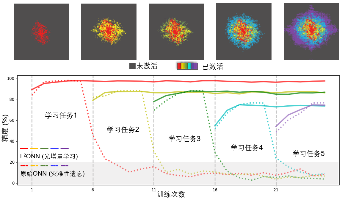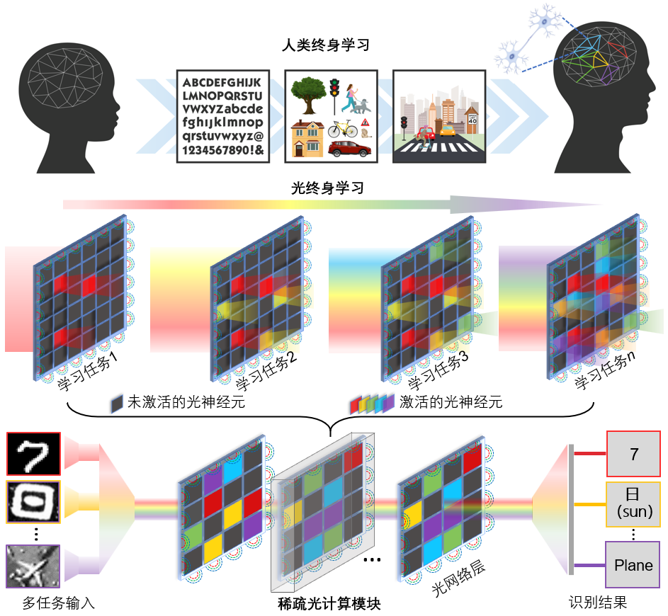 近年来,以光计算为基础、通过光电融合的方式构建光电神经网络已成为国际前沿的热点研究。然而,虽然以衍射神经网络为代表的各式光网络不断涌现,但是现有的光电系统中的基本光学计算单元普遍受限于固化的结构与较低的扩展性,极大地限制了光本身的物理潜能和计算能力,导致当前光网络只能实现简单的单一任务,学习新任务时无法克服灾难性遗忘的问题。