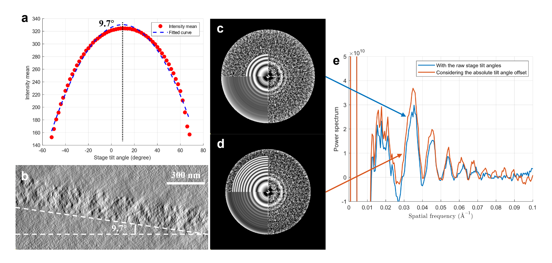 图2.绝对倾角偏移估计与经历尺度变换后的CTF衍射环(Thon ring)对比
