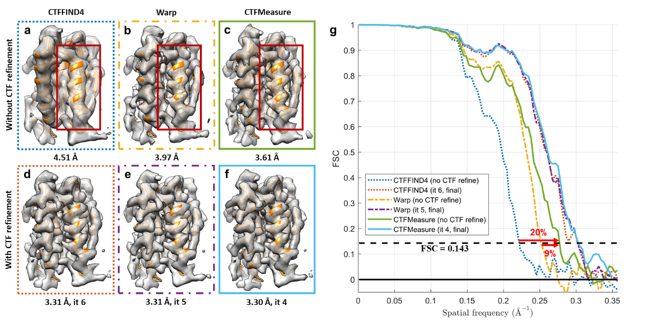 研究团队基于上述联合估计方法,开发了名为CTFMeasure的新软件。测试表明,相对于已有方法,CTFMeasure可以在功率谱中展现出更加清晰的CTF衍射环花样(图2);并以此为依托,在实现准确离焦量估计的同时,为用户基于CTF衍射环的数据质量评估提供数据支持。实验表明,使用CTFMeasure估计的离焦量可以为子断层平均(subtomogram averaging)提供更加精确的初始离焦量估计,为获得高分辨率的蛋白质结构三维重构提供有力支持。更好的离焦量初始值也有助于减少三维结构解析计算的迭代轮数,提高计算效率(图3)。
