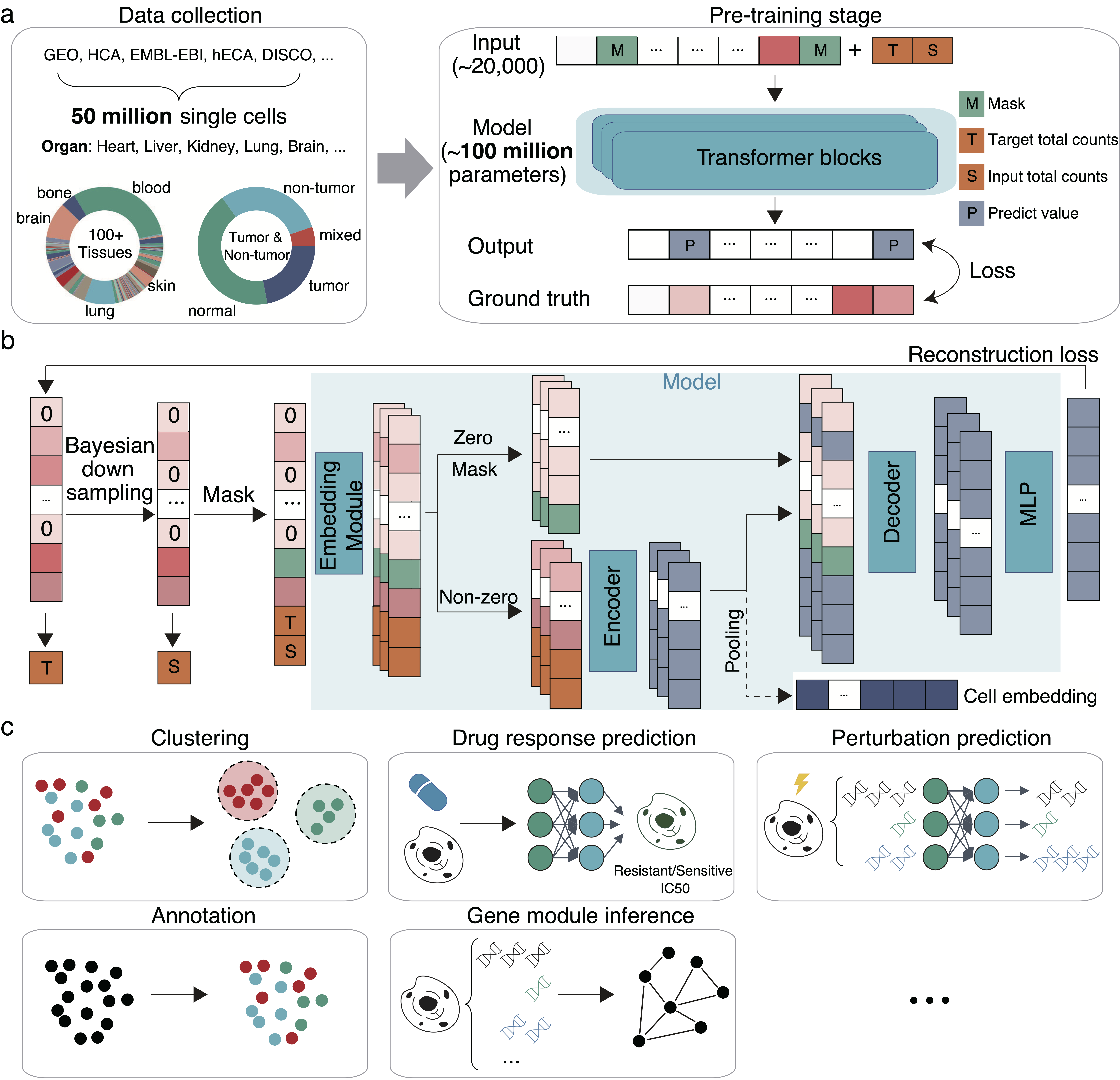 0033990威尼斯自动化系生命基础模型实验室主任张学工教授、电子系/AIR马剑竹教授和百图生科宋乐博士合作,建立了一个名为scFoundation的细胞大模型。该模型基于5000万个细胞的基因表达数据进行训练,拥有1亿参数,能够同时处理约20000个基因。作为基础模型,它在“虚拟药物试验”等多种生物医学下游任务中表现出卓越的性能提升,提供了人工智能在单细胞研究中的新范式(图1)。研究成果于2023年5月完成,2024年6月6日以“单细胞转录组大规模基础模型(Large-scale foundation model on single-cell transcriptomics)为题,发表于《自然·方法》(Nature Methods上。