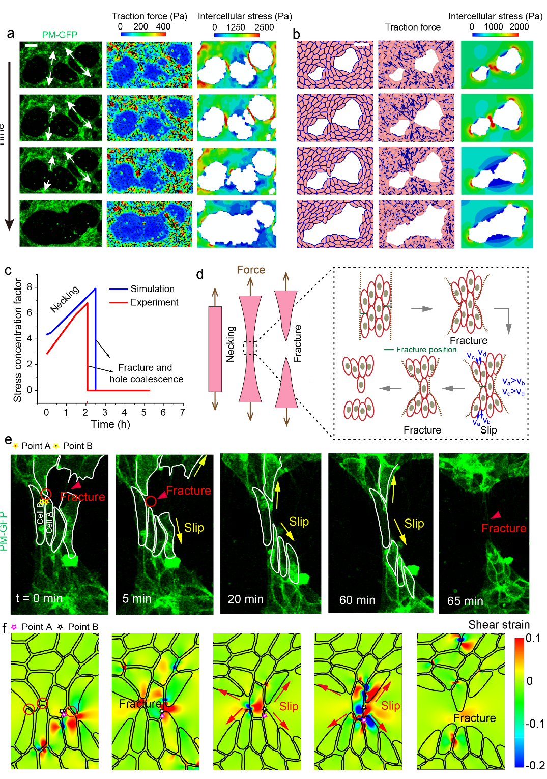 图2.孔洞融合:(a)孔洞融合实验;(b)孔洞融合模拟;(c)孔间多细胞桥应力集中;(d)孔间多细胞桥发生局部颈缩;(e)多细胞桥的断裂−滑移;(f)多尺度力学模型模拟多细胞桥的断裂−滑移现象