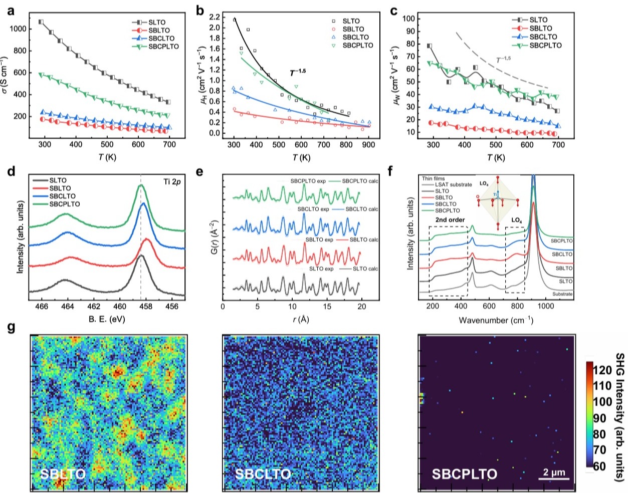 电输运方面,从中熵的(Sr0.4Ba0.4La0.2)TiO3到(Sr0.27Ba0.27Ca0.27La0.2)TiO3再到高熵的(Sr0.2Ba0.2Ca0.2Pb0.2La0.2)TiO3,随着熵的增大,虽然声子的散射在不断增强,但是样品的迁移率呈现上升的趋势,展现出电热输运解耦的现象。通过X射线光电子能谱(XPS)、同步辐射对分布函数(PDF)、拉曼表征、二次谐波表征(SHG)可以推断,熵增大时迁移率的提升,可能和TiO6八面体中Ti的位移有关(图2)。