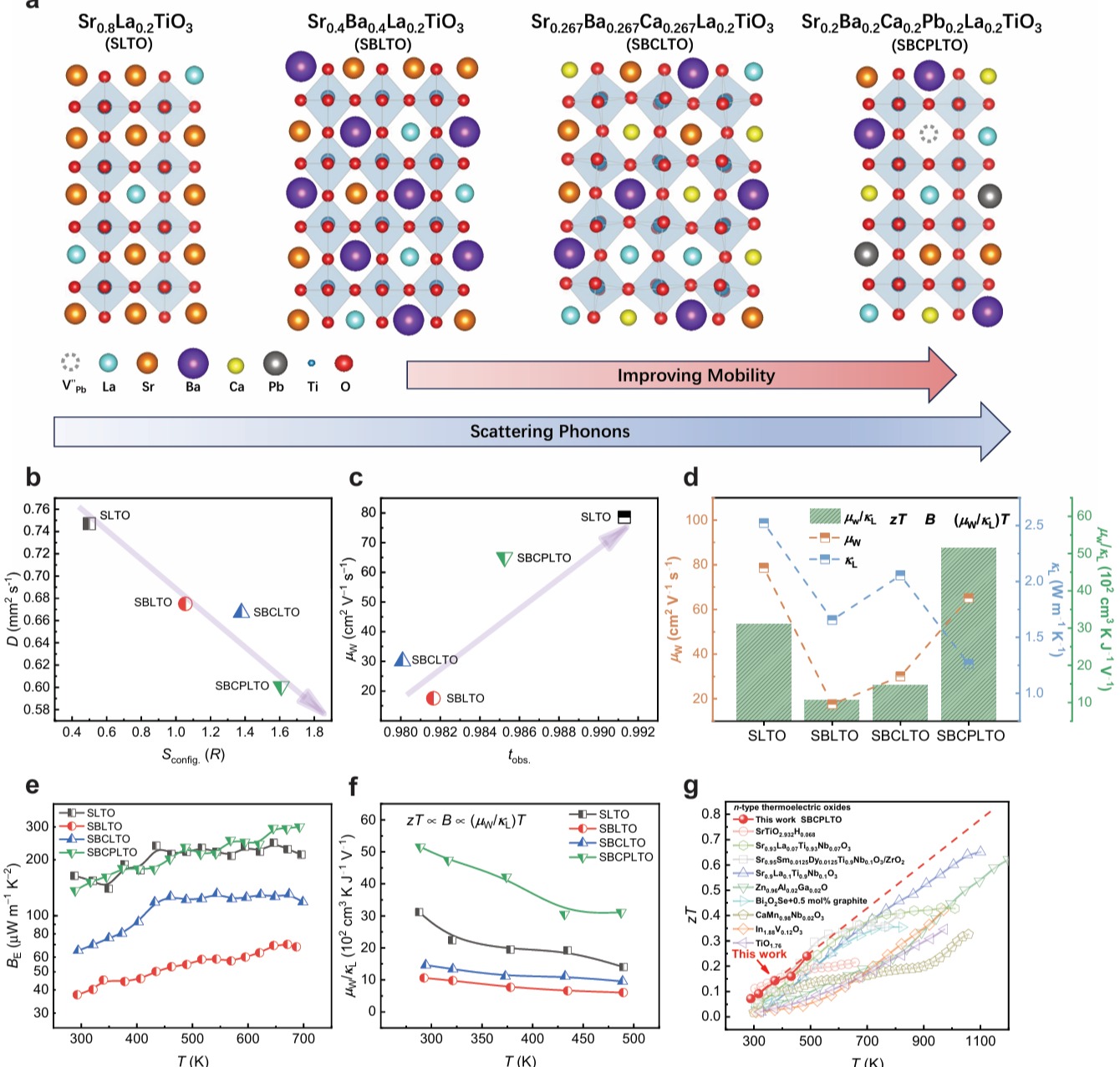 近来,0033990威尼斯材料学院林元华教授团队提出熵工程策略,通过熵设计时对钛酸锶晶体学位置的选择和元素平均尺寸的优化,在引入质量、尺寸波动和高密度缺陷散射声子的同时,调控了Ti的位移以减少载流子散射,同步实现热导率的显著降低和载流子迁移率的优化,通过电声解耦提升了钛酸锶的热电性能。通过熵工程这一有效方法,脉冲激光沉积方法生长的高质量外延(Sr0.2Ba0.2Ca0.2Pb0.2La0.2TiO3薄膜的晶格热导率降低到了近非晶极限的 1.25 W m-1K-1,加权迁移率优化至65 cm2V-1s-1,使得电声解耦关键参数μW/κL提升到了~5.2×103cm3K J-1V-1,最终在488 K实现了0.24的zT,在1173 K时的估值zT达到~0.8,优于其他n型热电氧化物。本研究有助于增进对熵效应的认识,提出的熵工程解耦电热输运的策略能够进一步推广以提升其他热电材料的热电优值,并且从熵的角度对于解耦其他a强耦合物理量提出了新思路。