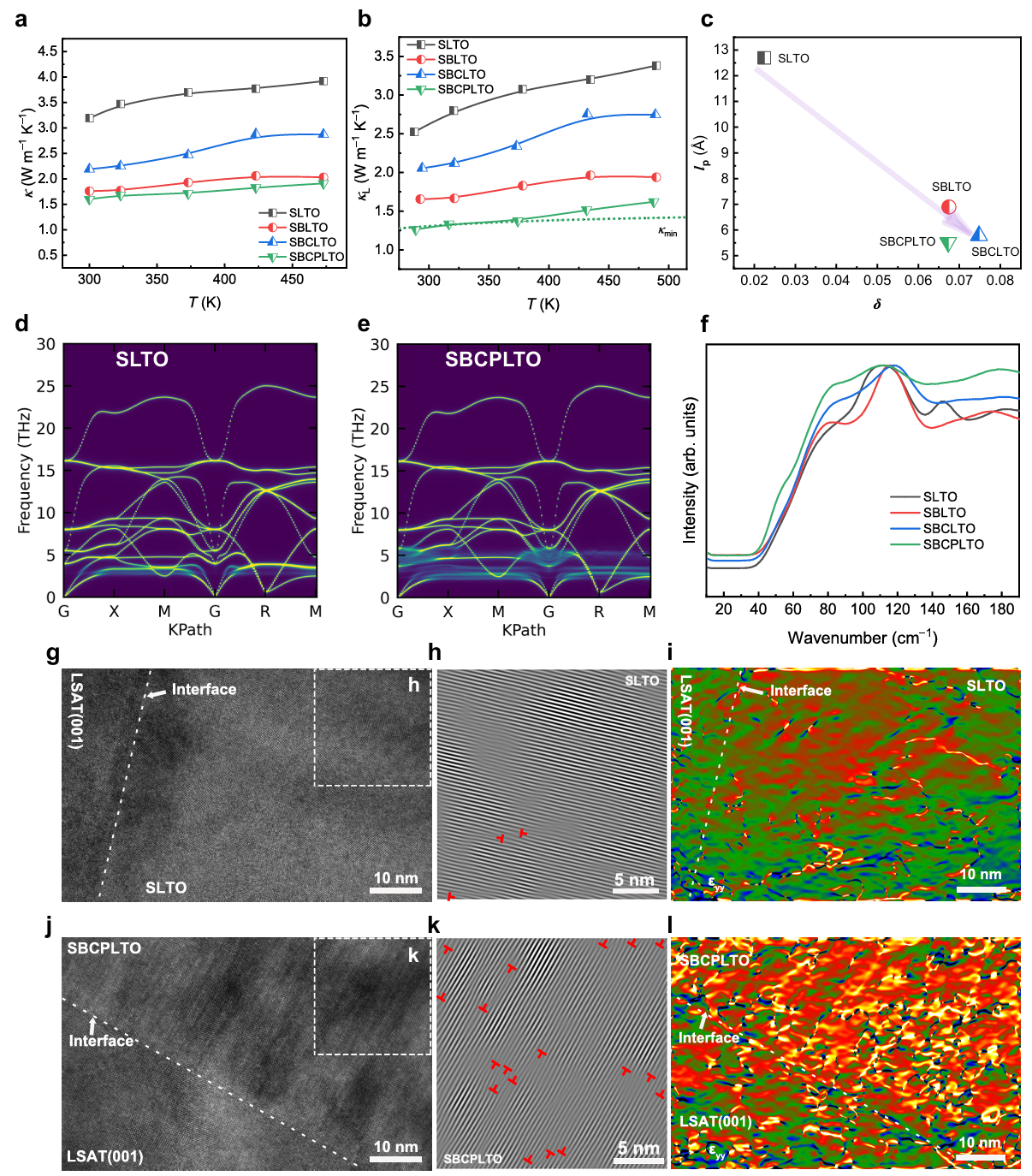 热输运方面,随着熵的增大,热导率数值整体上呈现下降趋势,并在高熵(Sr0.2Ba0.2Ca0.2Pb0.2La0.2TiO3样品中达到了近非晶极限。究其原因,本征角度,熵引入的元素尺寸波动和质量波动显著增强了声子散射。非本征角度,熵所稳定的高密度位错和强烈的应变,也是散射声子的重要来源(图1)。