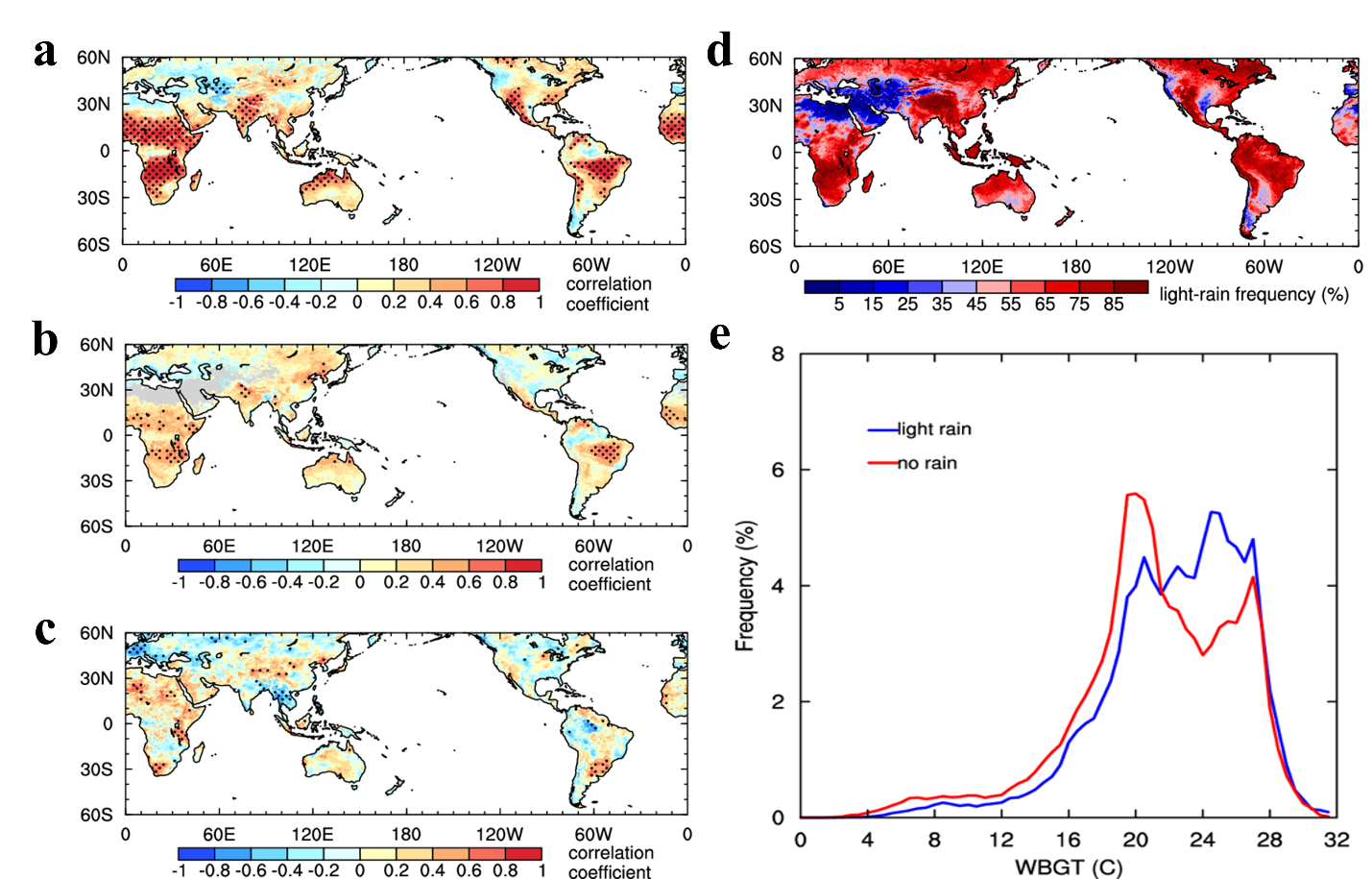 图1.(a-c)暖季湿球黑球温度(WBGT,湿热指标)与小雨频率(a)、中到大雨频率(b)以及总降水量(c)时间相关系数;(d)极端湿热天和其前一天小雨发生频率;(e)极端湿热强度在有小雨情况和无雨情况差异
