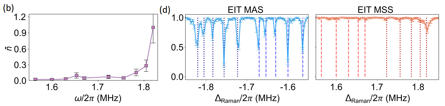 该工作中,研究人员演示了用137Ba+离子(I=3/2)进行EIT冷却。研究人员修改了用于量子比特状态初始化的激光设置,以在开放系统中执行EIT冷却。尽管在EIT冷却过程中S态所有zeeman能级都涉及到动力学,但EIT泵浦光束同时作为再泵浦光束,将所有态保持在冷却子空间中。研究人员在实验上将单个137Ba+离子的两种径向模式声子分别冷却到0.08和0.15。通过使用相同的激光参数,研究人员进一步将五个离子链的所有径向模式冷却到接近基态。