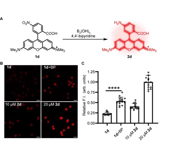 为了测试该硝基还原反应是否在活细胞中兼容,研究人员首先用荧光探针2d以及前体1d孵育细胞(图2A),1d的荧光通过PeT效应被硝基猝灭,1d被还原后则会恢复荧光。通过共聚焦显微镜观察到,添加B2(OH)4和4,4'-二联吡啶增加了细胞的荧光强度(图2B),表明该反应可以在生物相容条件下进行。通过荧光强度定量分析发现,反应收率在20%-40%之间(图2C)。