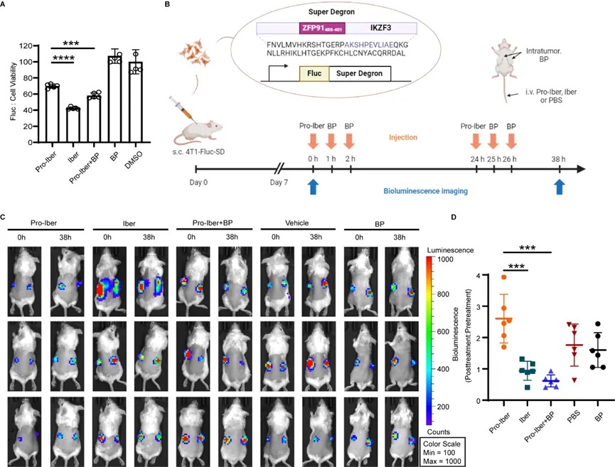 工作的最后,为了证明该方法在体内的有效性,研究人员构建了稳定表达Super Degron(SD)融合萤火虫荧光素酶(FLuc)的4T1细胞系(图5B)。SD系统使任何融合蛋白在IMiDs处理下都容易降解,研究人员设想Iberdomide的前药(Pro-Iber)可以在硝基还原条件下被激活得到Iberdomide(Iber)。首先在体外测试了这个降解系统,成功观察到Pro-Iber+ B2(OH)4/4,4'-二联吡啶组和Iber组的发光信号减少(图5A),表明该策略可以成功激活Pro-Iber并降解Fluc-SD。随后用表达FLuc- SD的4T1细胞构建动物模型,并成功观察到药物治疗组的生物发光信号下降(图5C,D)。结果表明通过硝基还原的前药激活策略在体内具有生物相容性,并有望实现靶向给药。