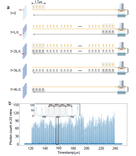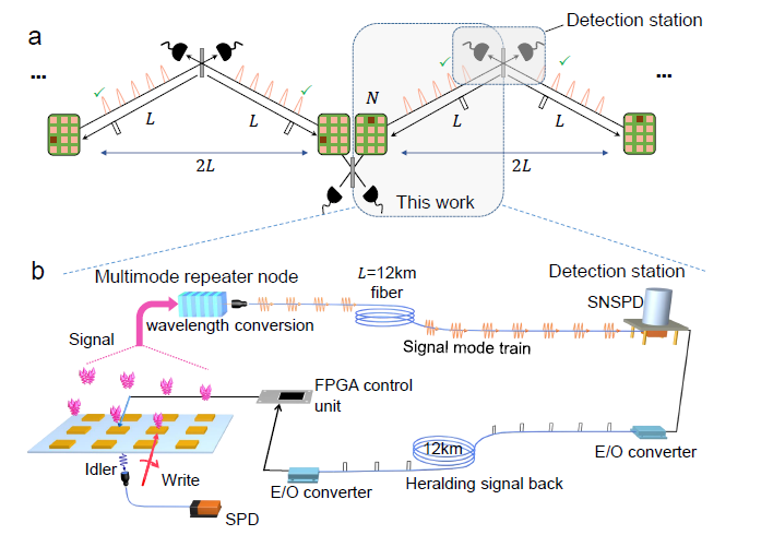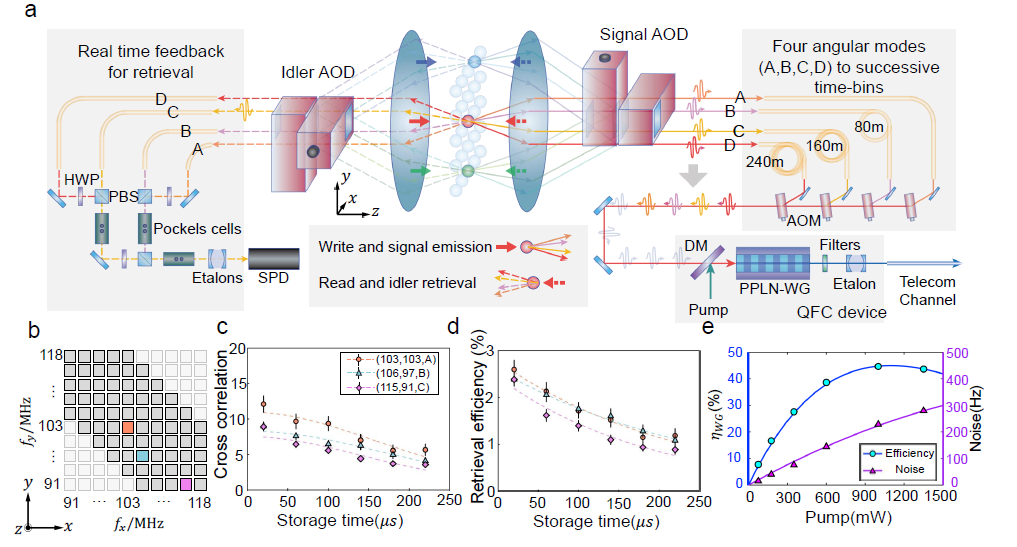 图1.多模复用的量子中继架构。通过依次激发70个独立可寻址的空间阵列存储器单元,产生280个时分(time-bin)光子模式。光子模式通过波长转换装置转换为通讯波段,在经过12公里光纤传输后在探测器上被探测