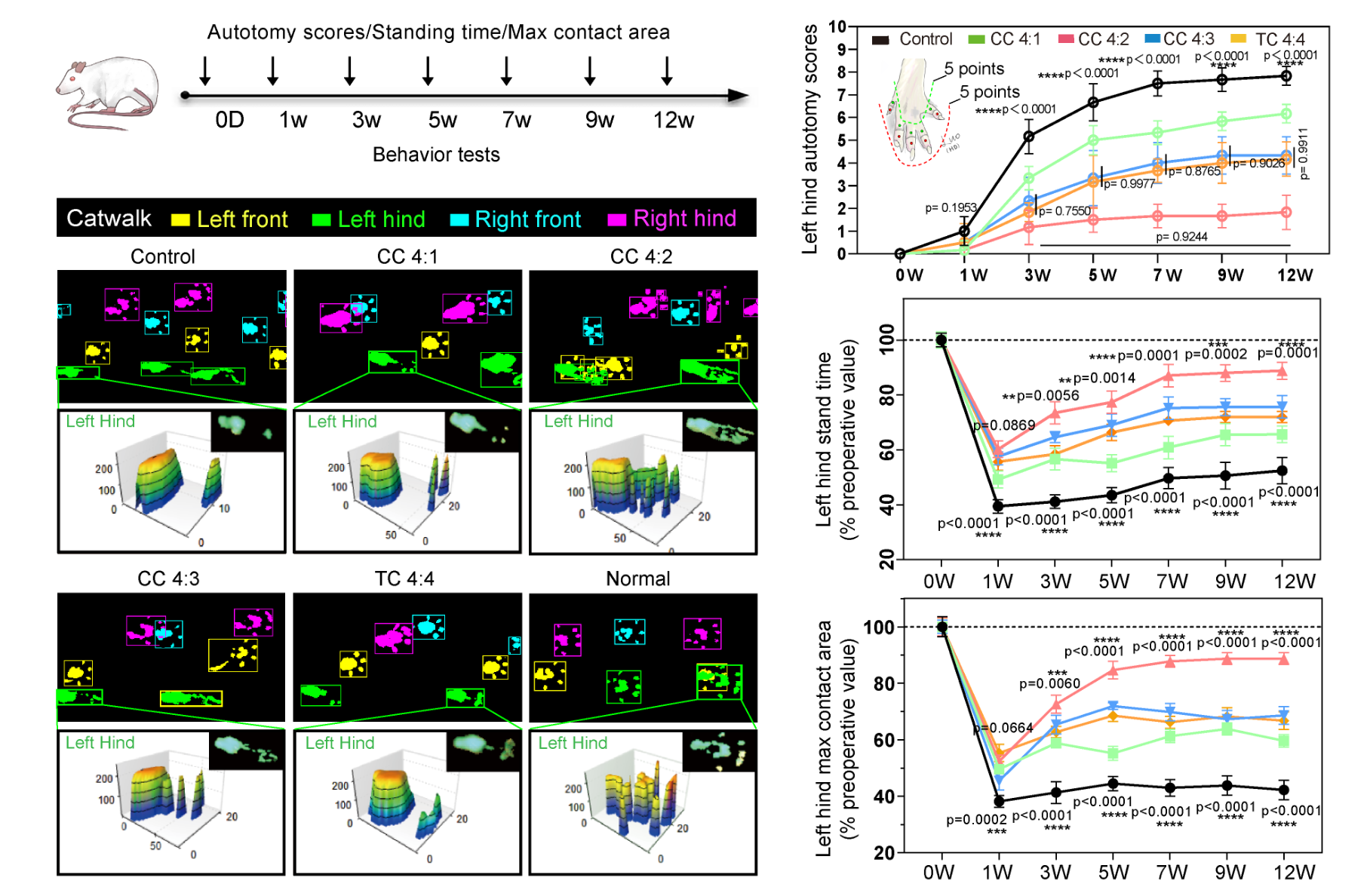 研究团队采用聚己内酯(PCL)和矿化胶原(MC)复合纳米纤维制备了具有不同锥度的中空圆台形空间约束套管(CC)来覆盖神经残端。研究表明,CC在体外激活雪旺细胞和成纤维细胞内YAP介导的机械传导,可以减少产生活性氧。在体内空间约束套管减少了再生神经组织内巨噬细胞的增殖、周围神经和脊髓(L4-L5)中巨噬细胞的M1型极化。特定锥度的CC4:2(近端和远端内径比)在神经自组织方面表现最佳,包括管理神经残端接口的自然有序终止、减少纤维化疤痕以及通过YAP介导的机械传导减轻神经炎症。机械痛觉相关蛋白质的表达,行为学自嗜评分和步态分析进一步证明其可以有效减轻神经疼痛。总的来说,工程化空间约束策略为实现体内神经残端界面疼痛缓解提供了一种可行的解决方案,并具有巨大的临床转化潜力。