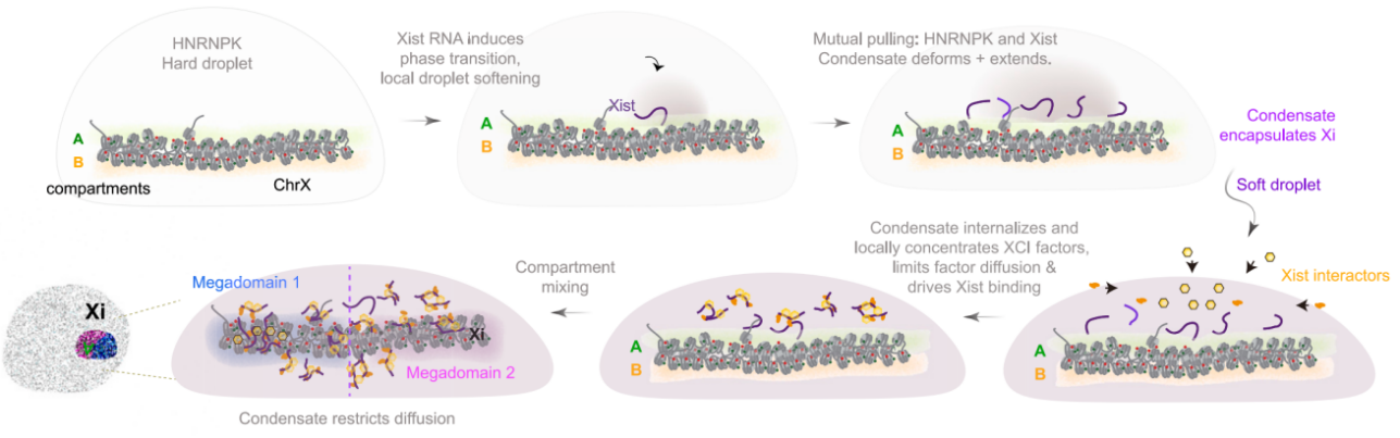 图3 HNRNPK-Xist形成特化相分离,促发并维持Xist的限制性扩散与X染色体基因沉默